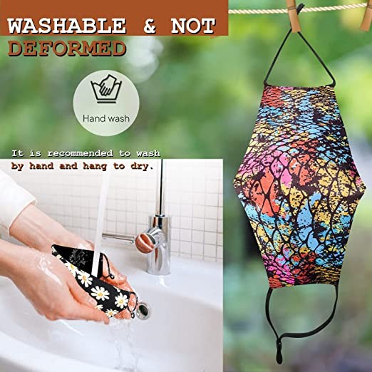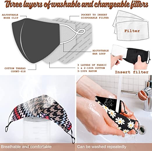 WASHABLE & REUSABLE: Machine wash cold, lay flat to dry, do not bleach; fibers maintain structure and softness even after many washes QUALITY FABRICS: Mask lining is 100% cotton, with polyester trim and interior pocket for a removable filter; Premium outside fabric layer is 121% polyester. ONE SIZE FITS MOST