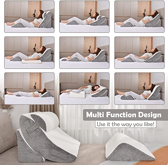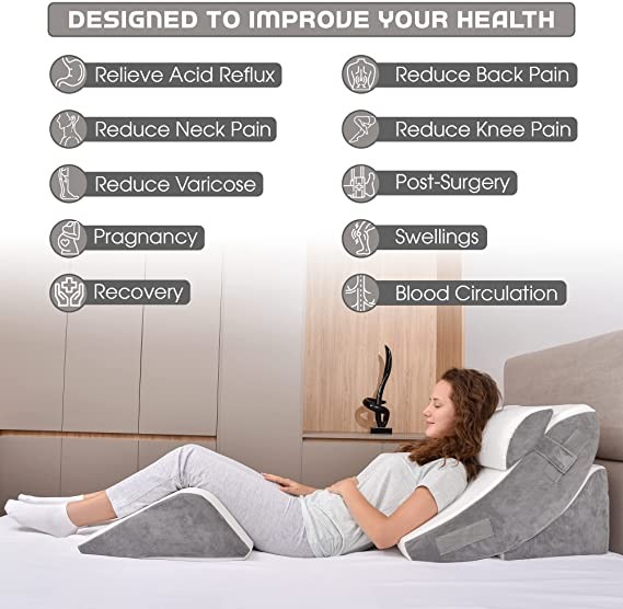 Bed Wedge Pillow Set of 4 – This orthopedic bed wedge pillow set comes with 1 pedestal pillow, 1 angled back pillow, 1 headrest and 1 lap pillow and instruction guide. Mix and match these post surgery wedge pillows to suit your needs.