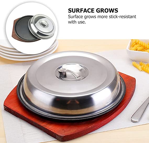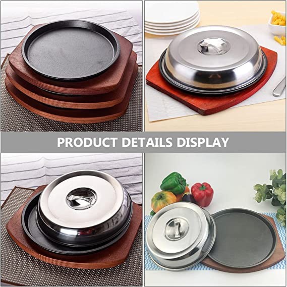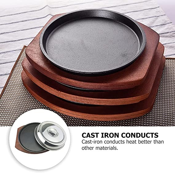 ?Multi-: This sturdy, high- quality iron plate is perfect for cooking and displaying stir- fry recipes for steak, grilled meat, vegetables, noodles, rice or any other food! With this cast iron plate and wooden base, you can serve your guests with hot and delicious food, and entertain guests without worrying about the food getting cold!
