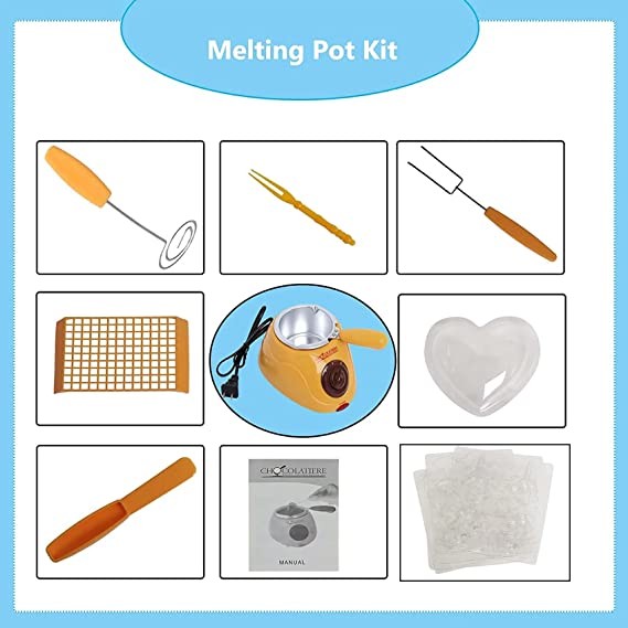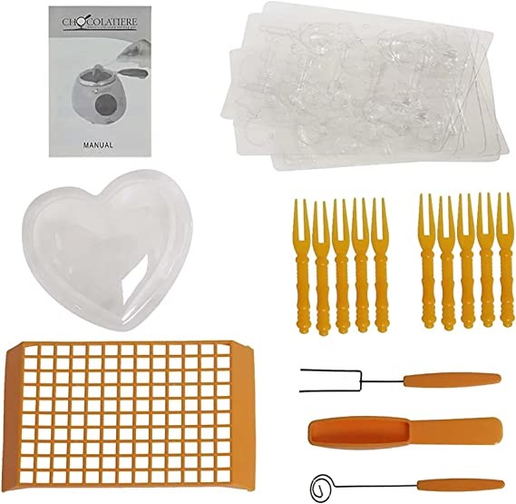 Package Included:1 X Basic unit,including melting pot,1 X Spatula,1 x Shelf,1 X Spiral fork for truffle dippig,1 X Flat chocolate-making fork for handling square chocolates,1 X Operating instructions and recipes,6 X Moulds(heart,bear,rabbit,coffee bean,star,christmas tree),10 X Plastic forks