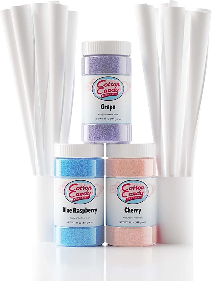 Complete Bundle: Includes a teal cotton candy machine, three 11 oz. resealable jars of floss sugar in blue raspberry, cherry, grape, and 50 paper cotton candy cones