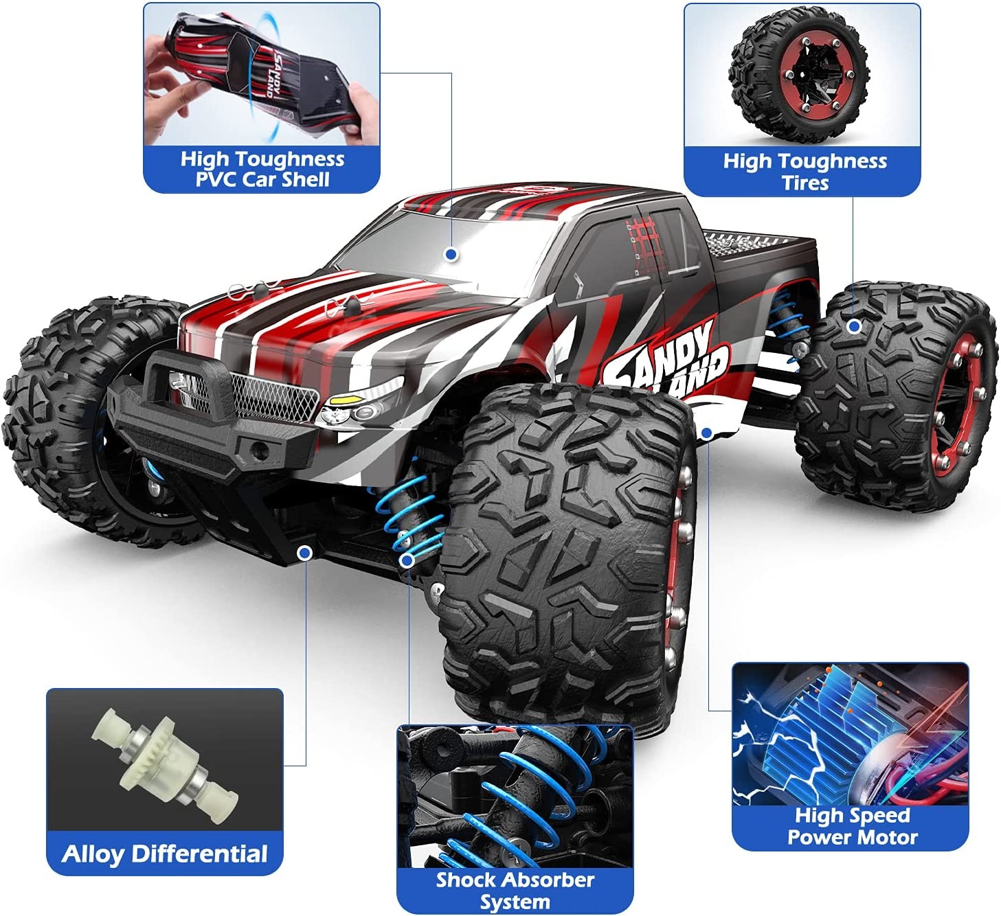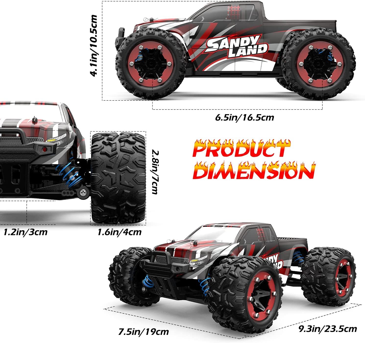Moter with Professional Metal Heat Sink: The monster truck is equipped with a 380 motor that can perform 21500 revs per minute, which made a huge enhancement for the acceleration and allows the RC car to have a top speed of 40+ km/h. There is a metal heat sink that fully covers the motor to enhance motor heat dissipation so as to extend motor life. Please note that the motor gets heated when the truck has been driven for a long time. We recommend you pause intermittently after 15 mins driving.