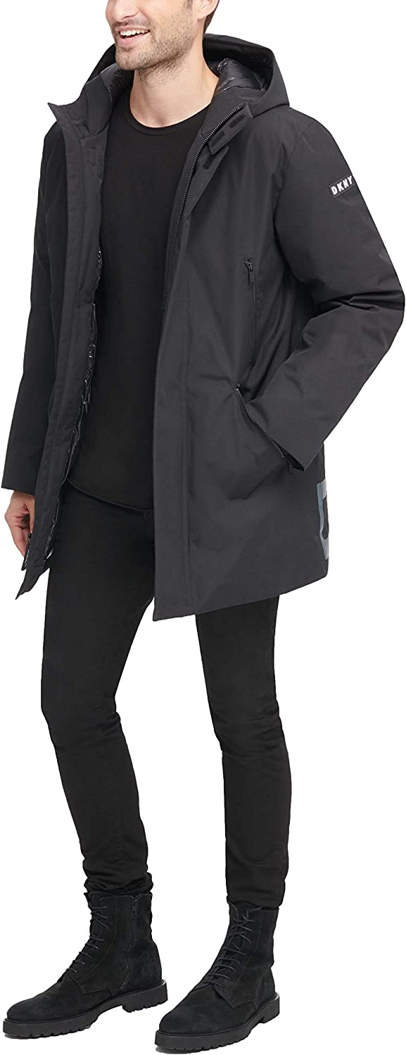 Two breast threaded pockets on the zipper, two lower threaded pockets on the zipper, and one inner lining pocket with screen print with dkny logo and zipper clasp.