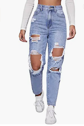 High waist, torn jeans, lightning on buttons in front, denim trousers with the effect of rubbing