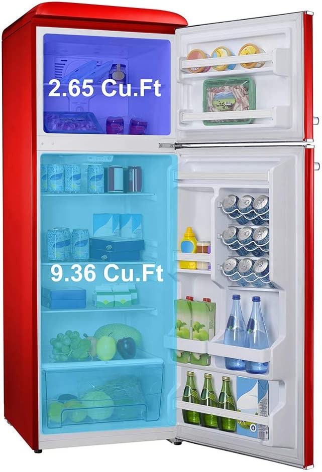 Retro Compact Refrigerator uses R600a high-efficiency and low-energy consumption compressor, it can cool food quickly with lower energy. Leveling legs can adjust feet and keep level placement anywhere.Freezer Capacity:2.65 cubic_feet.Fresh Food Capacity: 9.36 cubic_feet