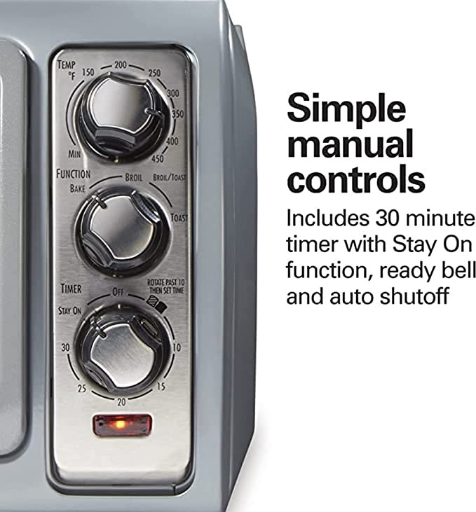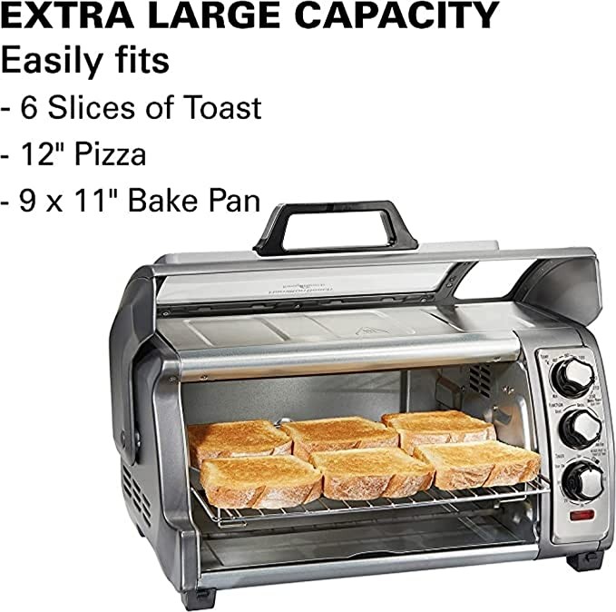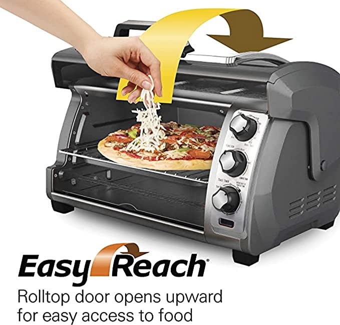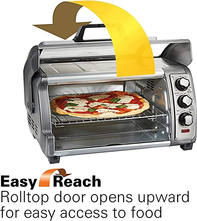 You won't find a design like Hamilton Beach's easy-to-pick toaster oven with roller top doors on it. Its unique large opening makes food easy to reach. The door opens above the oven, so the front countertop space can be freed up. Best of all, it's easy to keep clean because food doesn't spill over the door. The contoured dial is easy to grip and turn, making it easy to switch between baking, baking and toasting settings. Hold settings are safer thanks to a stop mechanism that prevents the knob from accidentally turning into hold. Care - This appliance is not intended for use by persons (including children) with reduced physical, sensory or mental abilities or lack of experience and knowledge unless they are closely supervised and instructed and are responsible for their safety. Close supervision is required when children use or when children nearby use any appliances. Children should be supervised to ensure they do not use appliances. Do not touch hot surfaces. Use the handle or knob. To prevent electric shock, do not immerse the power cord, plug, or toaster in water or other liquids. Unplug the plug from the socket when not in use and before cleaning. Cool down and install or remove parts before cleaning the equipment. Do not operate any device with a damaged power cord or plug, or use after a device has failed or fallen or damaged in any way. Power cord replacement and repair must be carried out by the manufacturer, its service agent, or a similarly qualified person to avoid hazards. Please call the customer service number provided for information on inspections, repairs or adjustments. Device manufacturers do not recommend the use of accessory accessories that may cause harm. Do not use outdoors. Do not let the rope hang on the edge of the table or counter or touch the hot surface. Do not place in or near hot gas or electric burners or heated ovens. Care must be taken when moving electrical appliances containing hot oil or other hot liquids. Use caution when removing pans or handling hot grease. Do not clean with a metal scrubbing pad. Parts can damage mats and touch electrical parts, creating a risk of electric shock. Oversized food or metal cutlery should not be inserted into the toaster oven as they may pose a risk of fire or electric shock.