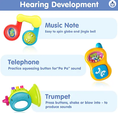 Various textures contribute to the development of touch, taste and smell. Many sounds will enhance your child's touch experience, and colors and patterns will help develop eye tracking skills.