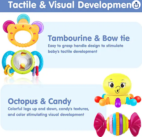 10 bright rattles/coloured intestines for different stages of the baby's development.