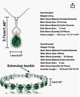 Material of high quality: this women's jewelry set is covered with white gold, the central stone - green emerald, and the side stone - white cubic zirconium. High polishing. High polishing. No nickel, hypoallergenic, constant shine. Won't change color, healthy and environmentally friendly.