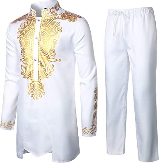 Style: set of 2 african-style items - jackets and trousers/long sleeves/Henley collar/cheongsam collar/slim fit/print with African tribal pattern/trousers: 10 side sloping pockets/elastic waist with adjustable cooking