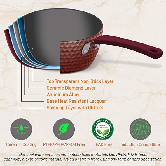 NON-STICK COATING: The non-stick cookware set has a durable long-lasting non-stick coating for easy tossing, cleaning and healthy cooking. The blue diamond ceramic outer layer makes the pan more durable and has better heat transfer effect