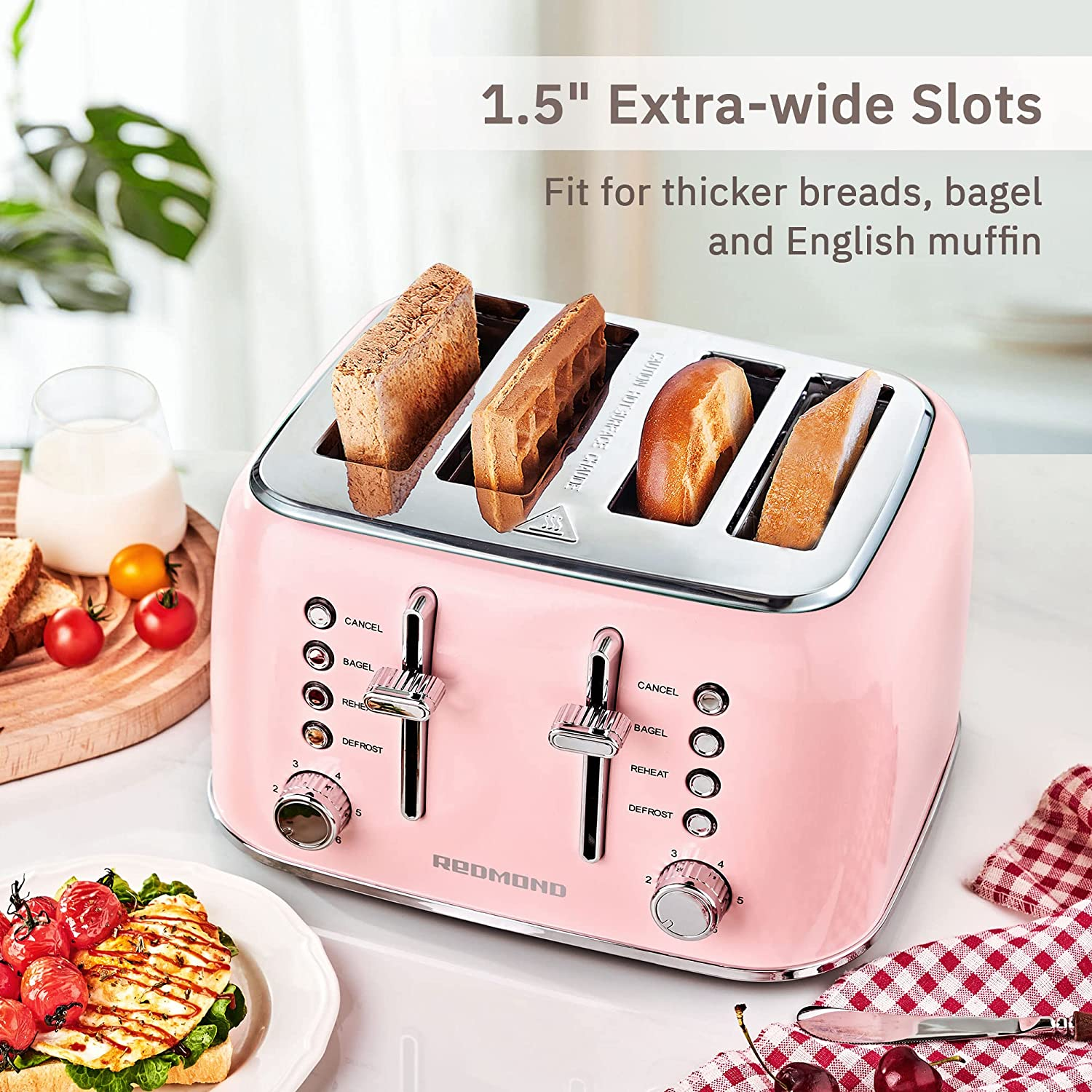 1.5 "super wide slot (~ 3.8 cm); With holes of 5.5 holes (~ 14.0 cm) x 1.5 holes (~ 3.8 cm) Redmond retro toaster with 4 slices easily handles bagels, English cupcakes and much more. Thicker or smaller products such as pumpkins. Cakes and Texas toast. The stainless steel structure avoids rust, all stains are easily removed. Food friendly materials that do not contain bisphenol a can provide better safety for family members during a delicious breakfast.