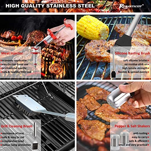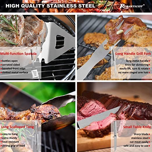 【QUALITY GRILLING ACCESSORIES】Each Essential of the grilling tool kit is made from high quality stainless steel, which is glossy, rust-resistant and heavy duty. No need to worry about sudden bending or melting in the process of grilling and all BBQ accessories can retain luster, durability and flexibility over years of use.