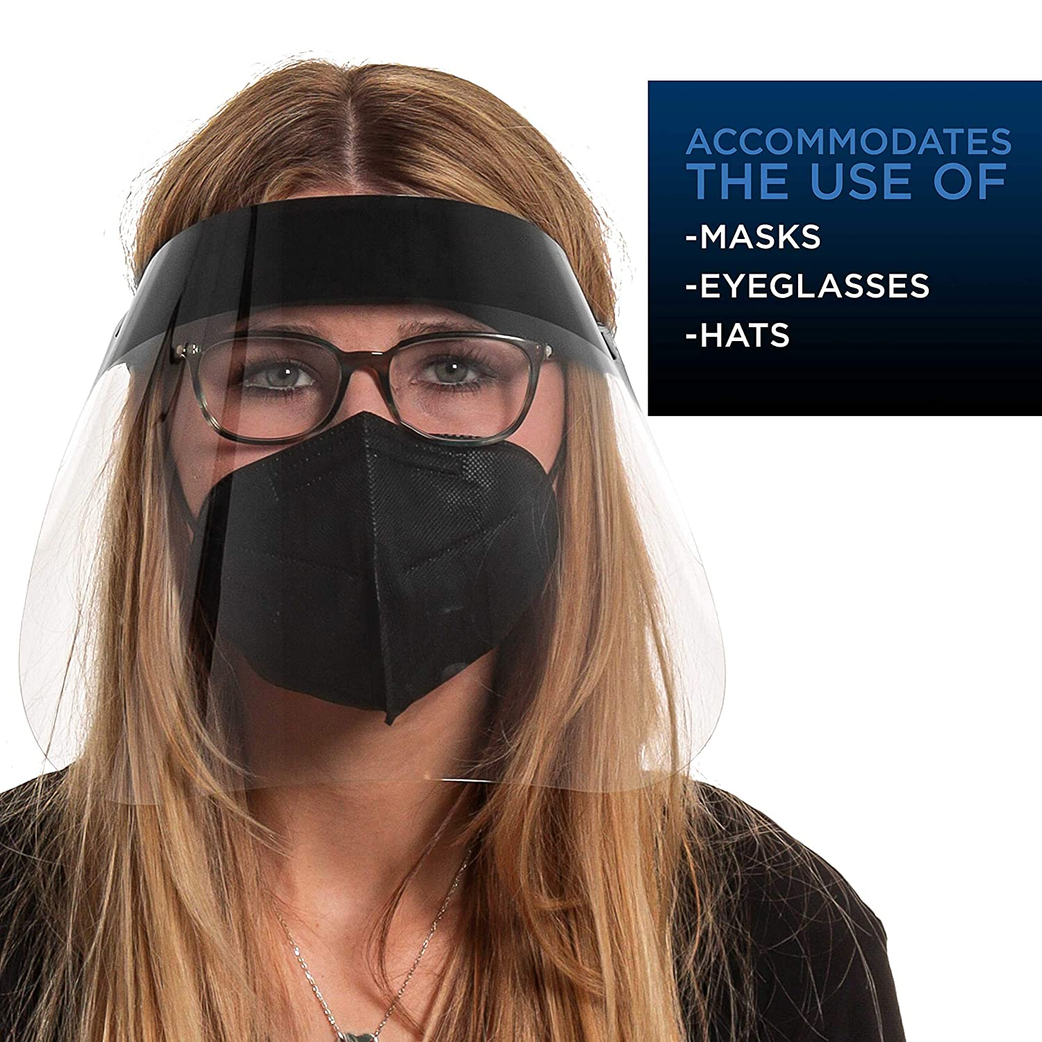 Comfort black mask set (160 PCS.) Hygienic, durable, light, comfortable premium protective masks made of very transparent thick plastic. Each shield includes an elastic head and a soft, comfortable forehead foam cushion. The mask has enough space between the face to use the mask, glasses and hat. One size fits all.