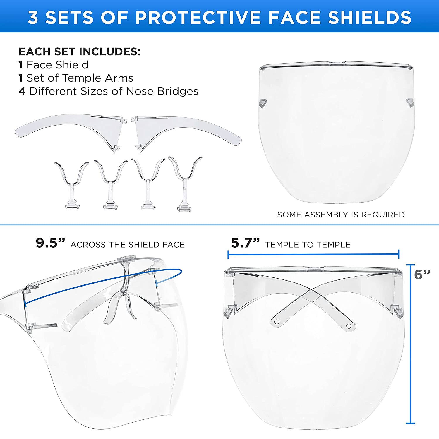 3 box face shield glasses: comfortable, stylish and hygienic premium face mask. Made of durable scratch resistant thick polycarbonate rigid plastic. Wear glasses like a mask when wearing glasses on your ears and on your nose (each panel includes 4 sizes of your nose so you can adjust your landing). You can also wear glasses and a protective mask under the shield.