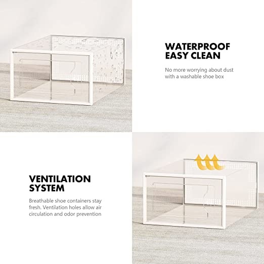 Say goodbye to mess: Stackable shoe storage boxes, dust-free, maximize storage space. Features a snap-on closure to create a shoe tower that will take your shoe rack to the next level. Find the right shoe with a glance through the see-through front door.