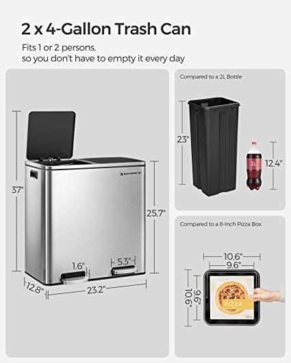[What you will receive] A double trash can measuring 23.2"L x 12.8"W x 25.7"H (approx. 59.1cmL x 32.8cmW, 2 compartments for 8 gallons, 15 trash bags, plastic inner bucket, and A soft closure mechanism for easy garbage disposal
