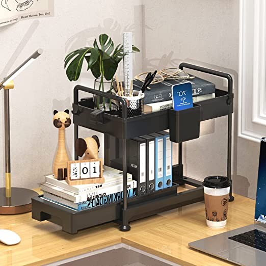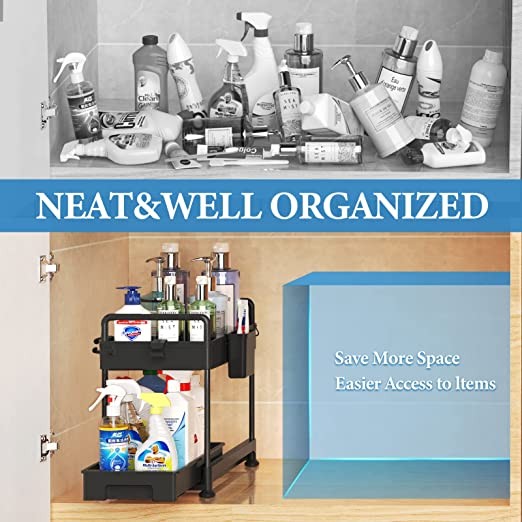 【Slide Out Drawer】The bottom slide out drawer of the under sink organizer makes it easier to access items and place them in limited spaces. 2-tier design, make full use of vertical space.