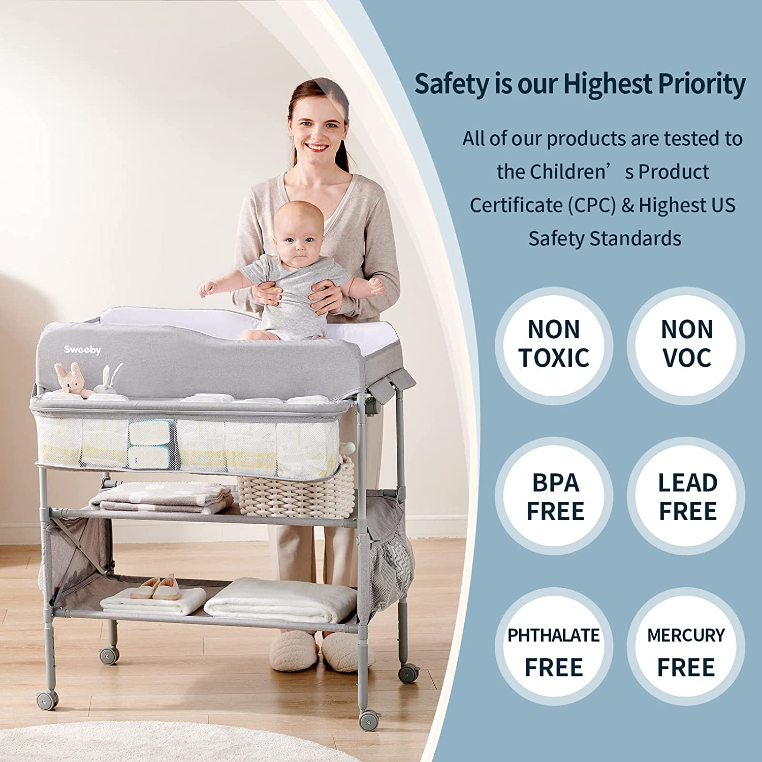 Patented design and certification - The classic square square of the replacement table dresser is popular with the public and combines the latest foldable and mobile features. The Sweeby changing Table is CPC certified and meets or exceeds all safety standards set by ASTM. Made from 100% native materials, excluding waste recycling materials. It's an exclusive Sweeby design.