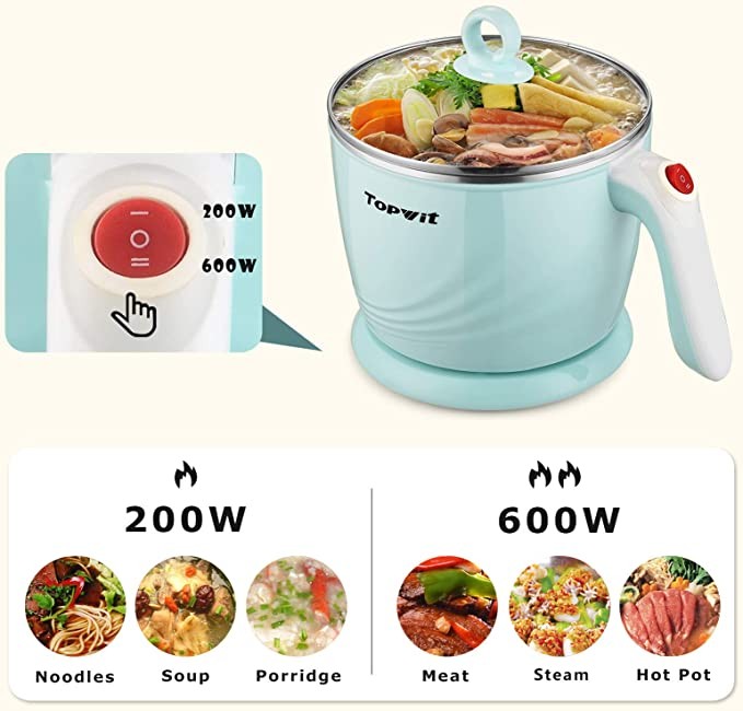 Topwit Electric Hot Pot Mini, Electric Cooker, Noodles Cooker, Electric Kettle with Multi-Function for Steam, Egg, Soup and Stew with Over-Heating & Boil Dry Protection, Dual Power, 1.2L, Green