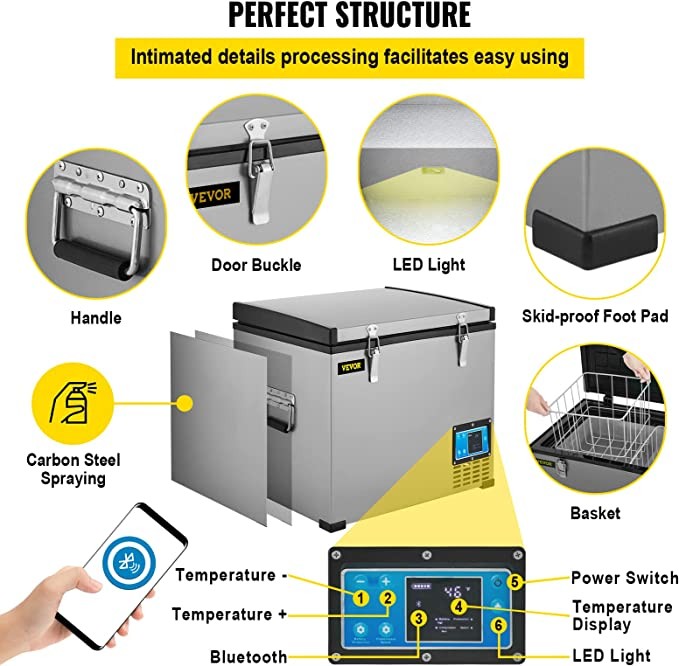 VEVOR portable refrigerator 48 quart (approx. 48 liters) 12 volt refrigerator with compressor and application control, metal enclosure chest refrigerator,-- 35°F to 44°F, DC 12/24V, AC 110-240V (home