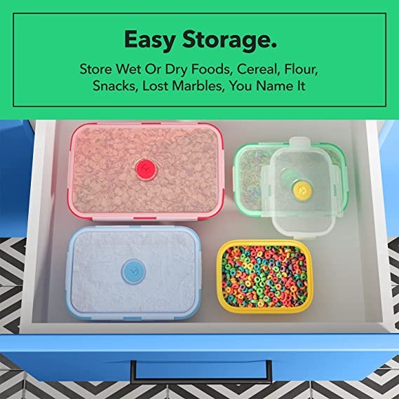 FOLDS AND STACKS - Each of the 4 progressive sized containers folds down to 1/3 of its original size. Open it or fold it and stack it up to 4.5 inches high. Rectangular pantry containers fit into almost any kitchen cabinet or drawer.