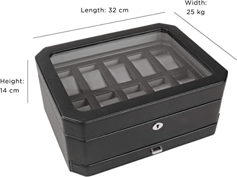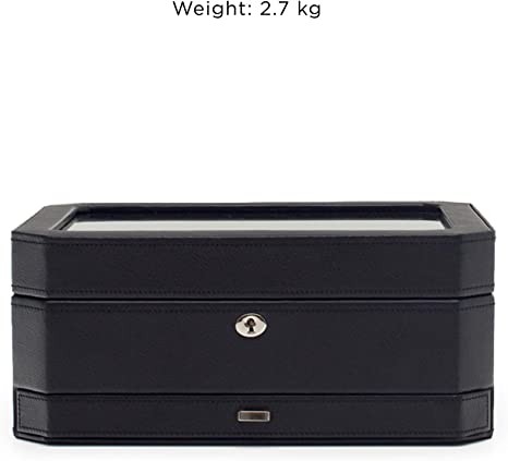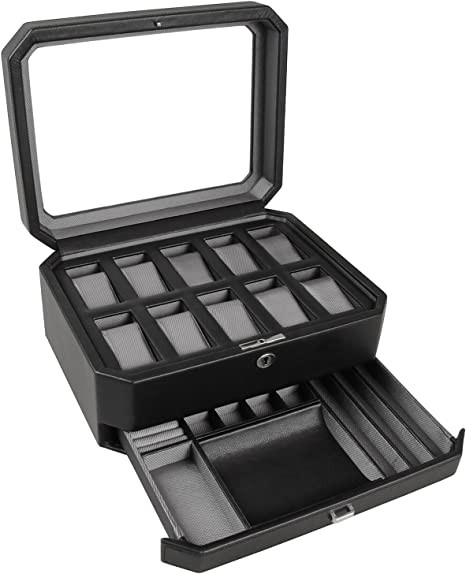 Storage: Valet drawer (8 ring rolls, 17 jewelry compartments) and 10 watch storage