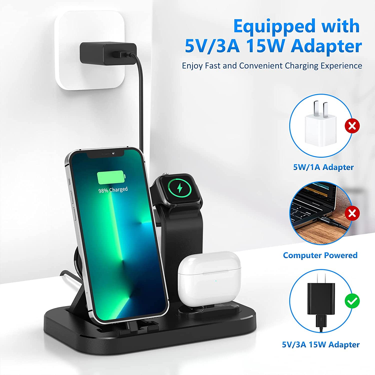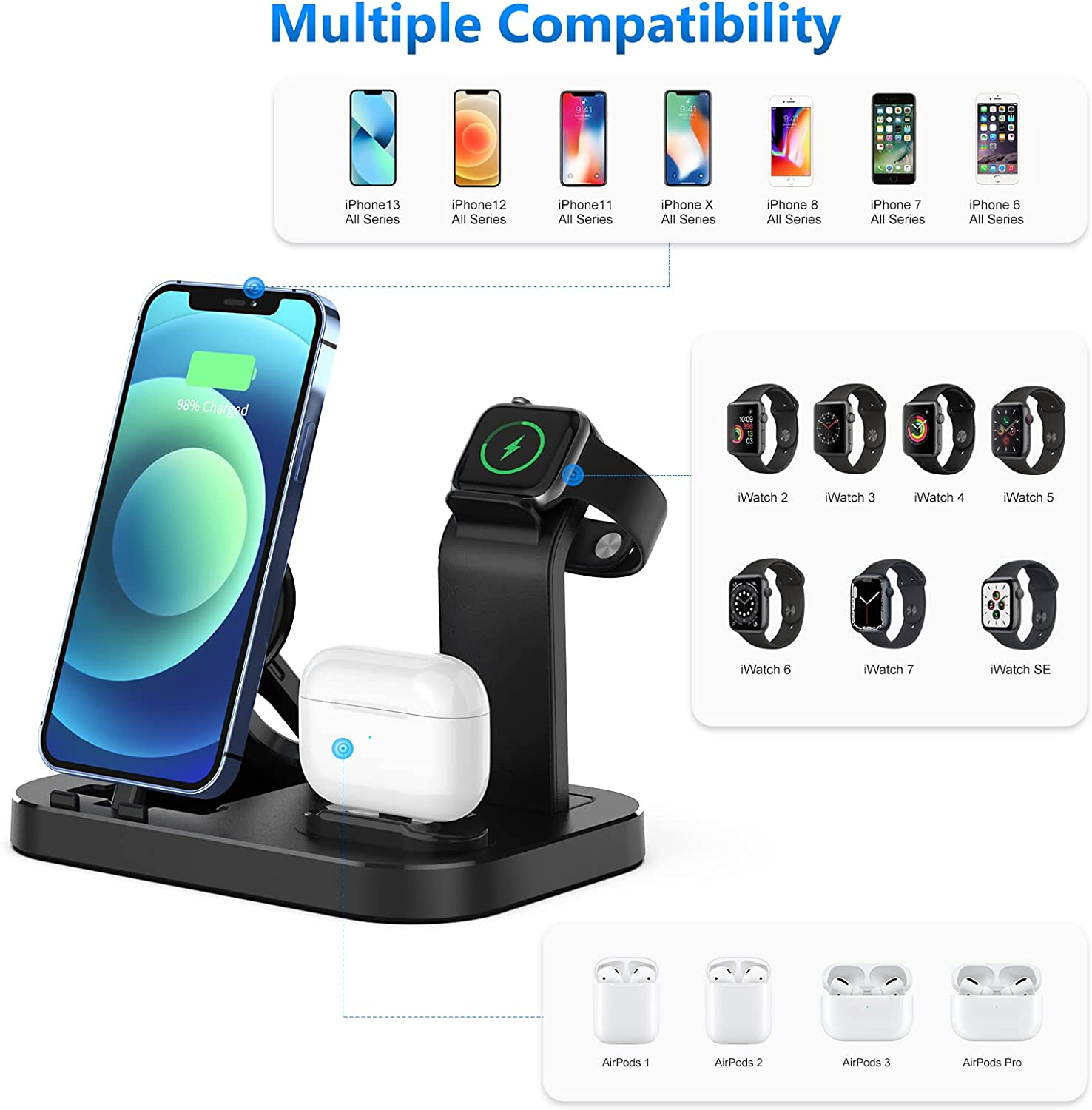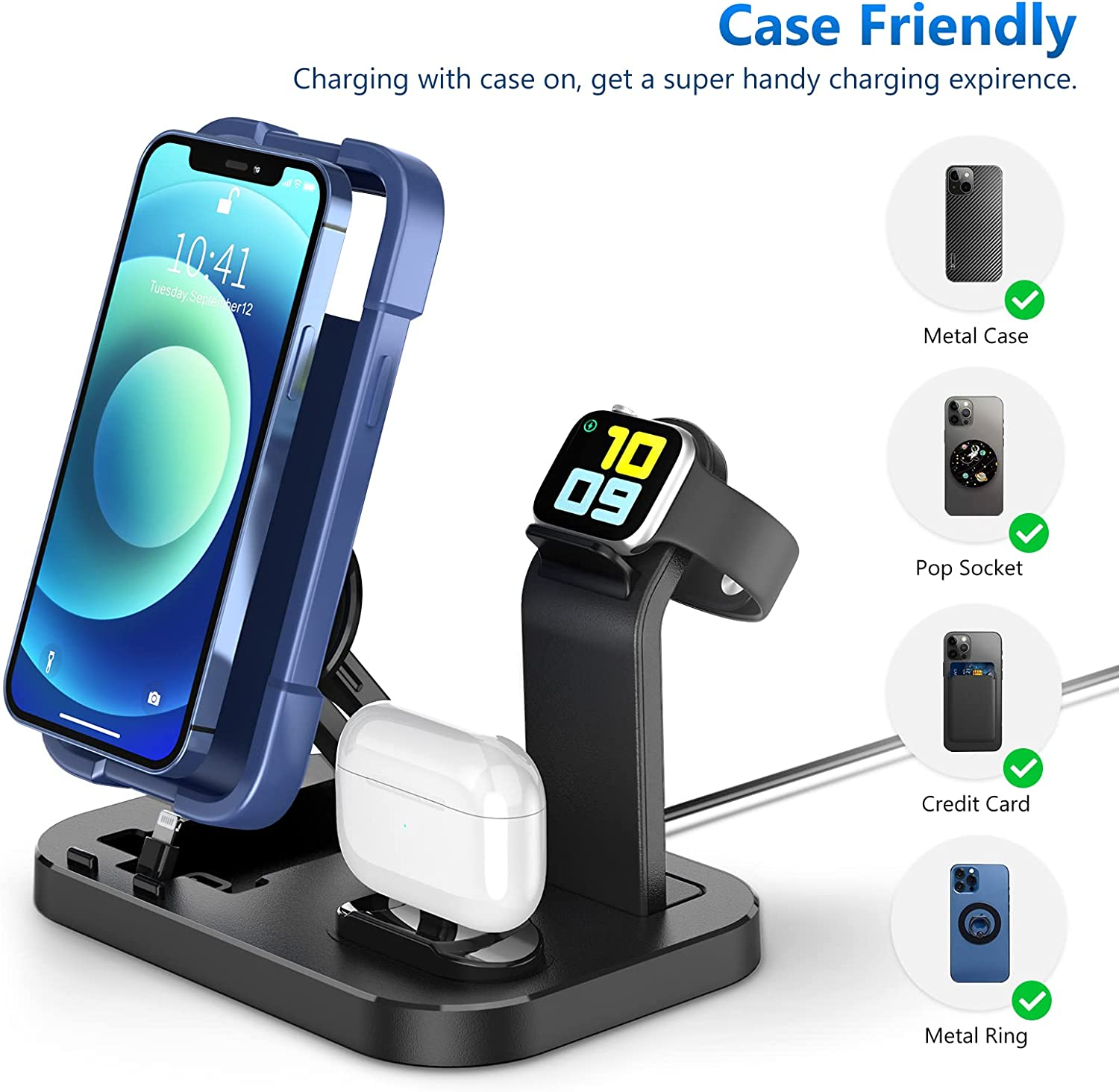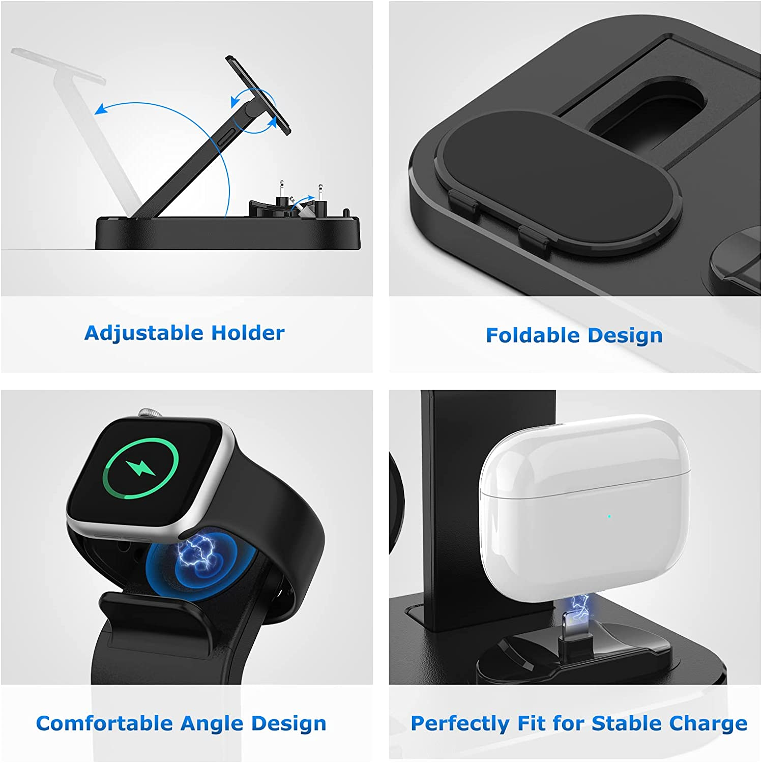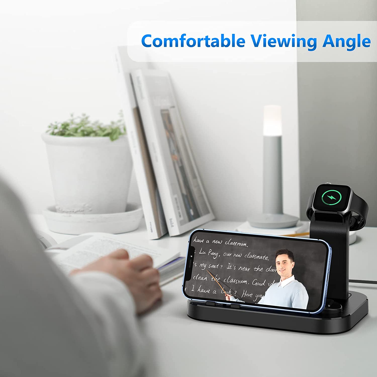 [folding and portable] 3-b-1 charging station for apple devices is simple to configure and works immediately after unpacking. Fast charging up to 15 w is supported. Easy to understand, small size, convenient to take with you on the road. You can position the phone vertically to charge and play or horizontally to watch the video.
